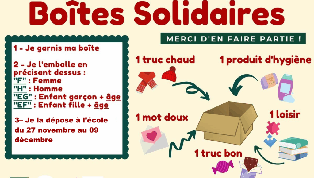 Si vous souhaitez soutenir ce dispositif, vous pourrez déposer une boite à l’école de Bonnefamille du jeudi 27 novembre au mardi 09 décembre 2025.