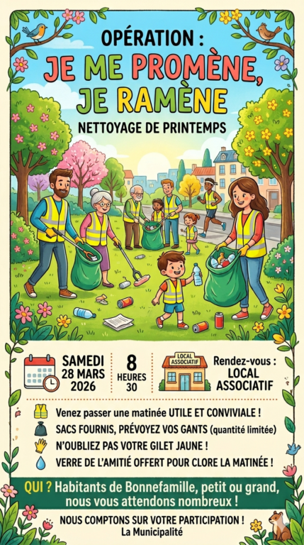 Dans le cadre de notre initiative de nettoyage de printemps, la municipalité vous invite à participer à l’opération « Je Me Promène, Je Ramène ». Que vous soyez citoyens, petits ou grands, membres d’une association, d’un club sportif ou d’une entreprise, nous vous attendons nombreux et nombreuses :